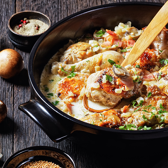 Read MoreIngredients:8 chicken thighs500 g mushrooms80 ml white wine100 ml chicken stock60 ml cooking cream1 red onion1 tbsp butter3...