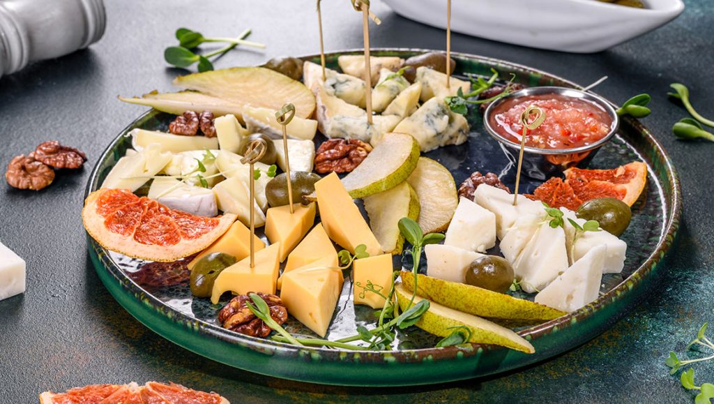 The easiest way to please everyone is to combine soft and hard cheese. Hard cheese like Parmigiano Reggiano, Pecorino, or Grana Padano pair beautifully with cured beef, while grapes, pears, or apples add a fruity lift to their sharper notes. Brie and Camembert spread effortlessly over a slice of bread and match well with figs, pears, or raspberries. You can also add spreads- ajvar, fig or plum jam, and honey.