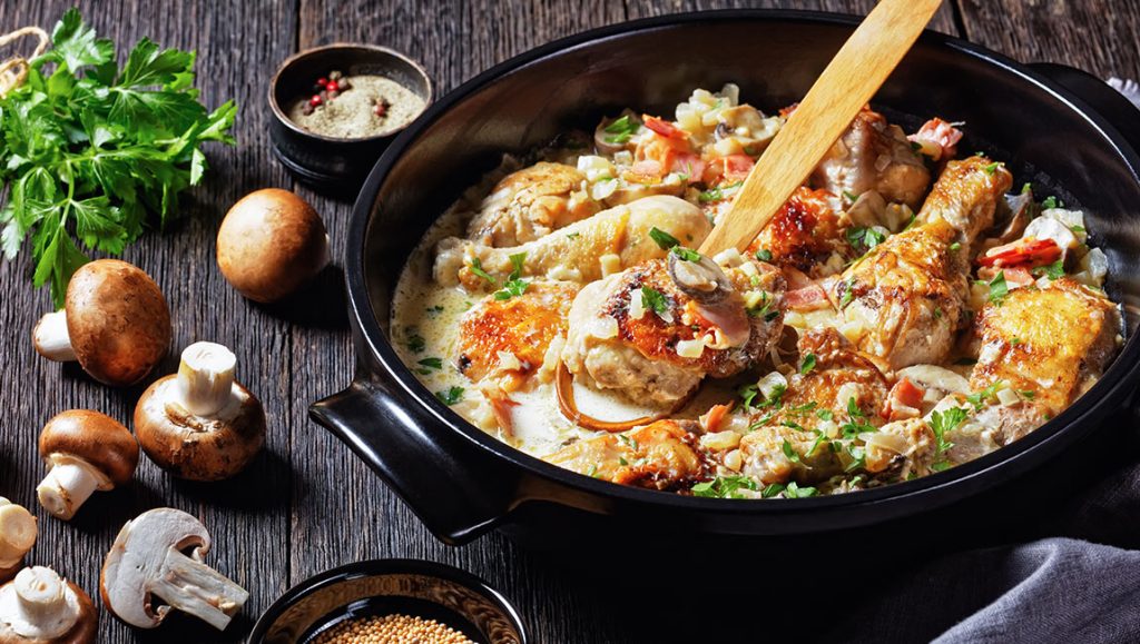 Weekend inspiration: chicken thighs in mushroom and white wine sauce